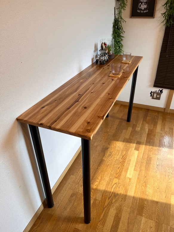 ※サイズ変更がある場合は、専用ページをご案内いたしますのでご購入前にお問い合わせ下さいませ。 ★商品説明★ 杉無垢材を使用し風合いのいいオシャレなアイアン丸脚のカウンターテーブルです。 どのお部屋にも合うシンプルなデザインになっています。 完全受注生産のハンドメイド品で、サイズは各種オーダーメイド可能となっております。 ★仕様★ ●素材 杉無垢板 F★★★★ 節有 板厚 24mm ※F★★★★とはホルムアルデヒド放出安全基準を最高基準にて満たしている木材でお子様がいる家庭でも安全にご使用いただけます。 ●商品サイズ 幅:1800mm 奥行:450mm 高さ:884mm(ハイタイプ) 高さは全3タイプ ①ロータイプ 684mm ②ミドルタイプ 784mm ③ハイタイプ 884mm ★サイズ変更可能商品★ ※幅700~1800mmまで変更可 奥行350~700mmまで変更可 高さ3タイプ ※上記以外の変更は特注お見積もりとなります。 ★オプション★ ①コード用切掛け加工 +500円(1ヶ所) パソコンのコードやケーブルを逃がす切掛けになります。 位置やサイズも指定可能です。 ②3連フック +2000円 天板裏側に荷物を引っ掛ける3連フックを取付可能です。 ③埋め込みコンセント2つ口(USB電源付) +4000円 埋め込み場所は指定可能です! ■サイズ別参考価格■ 天板サイズ 1200×400mm 36300円 1200×450mm 36500円 1200×500mm 36800円 1400×400mm 37300円 1400×450mm 37500円 1400×500mm 37800円 1600×400mm 38300円 1600×450mm 38500円 1600×500mm 38800円 1800×400mm 39200円 1800×450mm 39500円 1800×500mm 39800円 上記以外のサイズもオーダー可能です! お見積もりいたしますので、質問オーダー欄よりお気軽にお問い合わせください。 天板裏には、撓み・反り止め用の補強が入っております。 ●塗装について 水性ウレタンニスを使用 【特長】耐水性、耐久性が有り水拭き可能です。臭いが少なく、シックハウス、シックスクール対応、食品衛生法適合、ホルムアルデヒドF★★★★ ※天板裏はワックス塗装になります。 ◆カラーバリエーション◆ ①エボニー ツヤ有 ②エボニー ツヤ無 ③ダークウォールナット ツヤ有 ④ダークウォールナット ツヤ無 ⑤透明クリア ツヤ有 ⑥透明クリア ツヤ無 写真の最後に色見本がございますのでご確認頂けます。 ○ツヤの有無について○ テカリが有るか無いかの違いです。 ツヤ有りは高級感のある仕上がりになります。 ツヤ無しはアンティーク感のある落ち着いた仕上がりになります。 ■脚の組立方法■ 脚は簡単な組立式になります。 天板裏に脚を固定するボルト穴がございますので脚の座面穴と合わせて頂いてボルト留めをお願いいたします。 組立説明書を付属しております。 ■送料について■ 基本的に発払い発送で送料込のお支払いになります。 配送先の都道府県とサイズにより送料が異なります。 ※香川県より発送 ※ヤマト運輸・佐川急便・カンガルー便いずれかで発送。商品サイズにより運送会社が異なります。 ※詳細金額はご購入前にお調べしますので質問オーダー欄よりお問い合わせください。 ●●ご購入時の注意事項●● ・納期は約20〜30日前後での発送が目安となっております。 ※商品や注文状況により変動します。 ・ハンドメイド品をご理解の上ご購入お願いいたします。 ・天然木材は木目の柄や色違い、節や節の数、初期キズがある場合がございますのでご了承下さいませ。 ・商品写真はあくまでも見本品です。実際の商品と写真とでは木目や節の位置・数が異なります。 ・受注生産になりますので基本的には返品は不可になりますが、商品に不備がある場合には対応させて頂きます。 ※重要※ ①ご購入後 ※ご注文内容の確認 ②確認事項 ※仕様の詳細確認 ③発送前のご連絡 ※発送予定日、日時指定のご確認 ④発送後のご連絡 伝票番号や指定日時の確認 等、数回メッセージをお送りさせて頂きますので確認後にご返信をお願いいたします。 また商品受取後には【受取通知ボタン】を必ずお願いいたします。 Creemaのシステム上、受取通知を持ちましてお取引完了となります。 メッセージのご返信を頂けない方は申し訳ございませんが、確認が出来ない為、キャンセルとなる場合がございますのでご了承ください。
