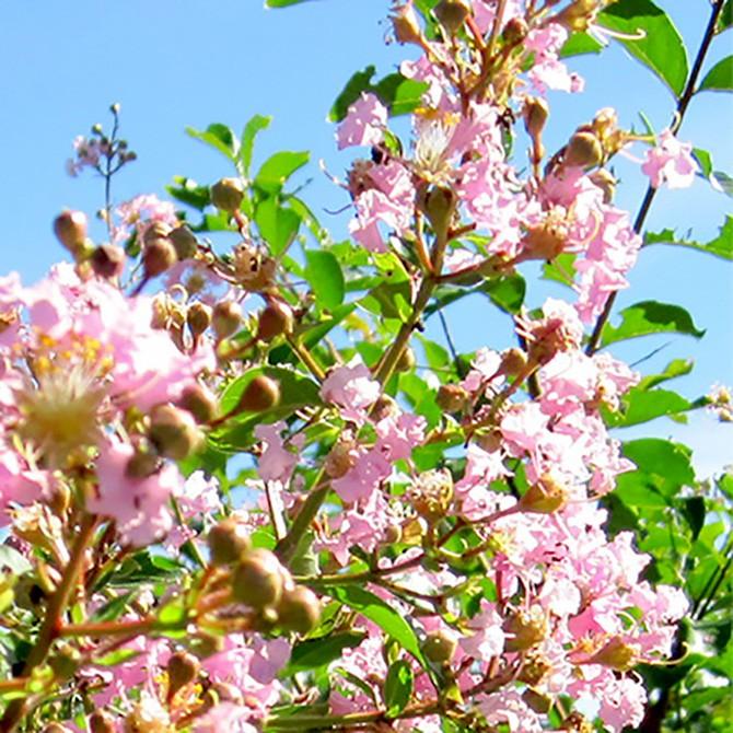 花の少ない夏から秋までの長い間、次々と花が咲き長い期間楽しめます。猿も滑って落ちてしまうという、白くすべすべの樹皮も特徴的です。マスコギーは薄紫
