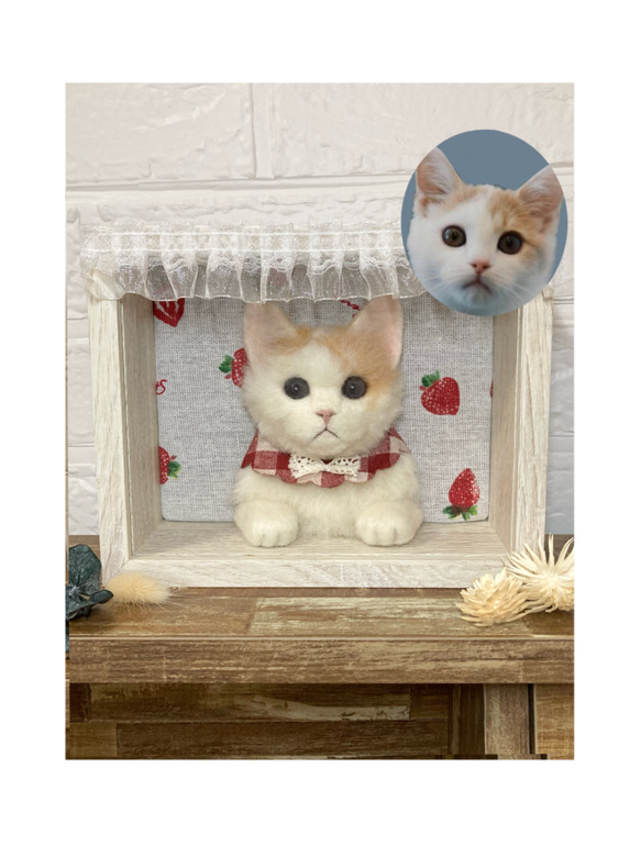 ご覧いただきましてありがとうございます*.゚ きゅるんとしたお顔が可愛いレッド&ホワイトの子猫ちゃんを作りました。 nyan boxはboxに入った半立体の 羊毛フェルト猫ちゃんです。 展示では反射を避けるためガラスを除いていますが、 正面にガラスが来るためお手入れが簡単にできます。 "愛猫ちゃんと一生一緒!"をコンセプトに お作りしています。 *.゚⋆⸜⸝⋆*.゚*.゚⋆⸜⸝⋆*.゚*.゚⋆⸜⸝⋆*.゚*.゚⋆⸜⸝⋆*.゚*.゚⋆⸜⸝⋆*.゚* .゚*.゚⋆⸜⸝⋆*.゚*.゚⋆⸜⸝ こちらは展示作品です。 ご購入はお控えください。 ご注文の際は、必ず「nyanbox ご注文方法と詳細について」をお読みいただいた上で、 ご注文用のページよりお願い申し上げます*´ㅅ`)♡⃛ ※ご注文用のページは、下記タイトルにて出品しております。出品がない際は、その月の受付は終了しております。毎月2日にご注文用ページを出品致しますので、どうぞよろしくお願い申し上げます。 作品タイトル 【ご注文用】nyanbox 羊毛フェルト 愛猫 オーダーメイド 必ずこちらのページよりオプション等をご選択の上、 ご購入ください。 他にも展示作品をご覧いただけますと幸いです*´ㅅ`)♡⃛ どうぞよろしくお願い申し上げます。 羊毛フェルト 猫 リアル ぬいぐるみ オーダー オーダーメイド