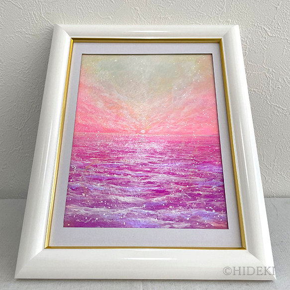 アクリル絵の具で描いた心象風景画 煌めく陽の光シリーズ ☆Love☆ 仕上げにパール系のアクリル絵の具を使い 煌めく陽の光を表現しています。 絵を見る角度、光の当たり方によって、 キラキラ✨と輝き 印象が変わります。 ☆原画サイズ:H140mm×W180mm ☆額サイズ:250×198mm ☆前面ガラス 背面スタンド付き 壁掛け可 ※実物作品とモニター環境の違いでの多少の色の誤差があることをご了承ください。