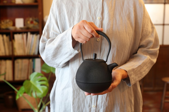 Eggの名の通り、卵の形が目に心地よい鉄瓶。なめらかで美しい鋳肌も魅力です。ティータイム1回分にちょうどいい0.9L。 フタのツマミは直方体に見えますが、指に添うようカーブしています。元デザイナーである作者のこだわりが細部に感じられます。 直径15.5×高さ22cm ※ガスレンジ対応(中火以下推奨) ※底面の直径が小さいため、IHでのご使用はおすすめしません。 ※持ち手はたおせます。 鉄瓶は水道水の塩素臭を抑え、お湯をまろやかにしますので、お茶やコーヒーがとてもおいしくなります。お家でほっこりするためのティータイムにぴったりです。 お手入れは特に必要ありませんが、鉄製ですのでさびが発生します。お湯を沸かした後ポットに移すなど、なるべく早く中を空にし、ふたを開けておくことでさびの発生を抑えることができます。なお、さびが発生しても水が赤くならない限り問題なくお使いいただけます。 一つ一つ手作りですので、サイズや色味、表情が少しずつ異なります。また、撮影時の光の加減やご覧になるディスプレイによって多少の違いが出ます。画像と若干の違いがありますことをご了承ください。 発送は平日のみとなっております。 |