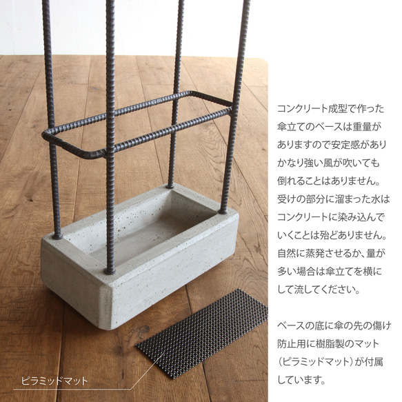 ◆ 商品名 コンクリートと鉄筋の傘立て ◆ 商品説明 鉄筋と成形したコンクリートを組み合わせて作ったシンプルな傘立てです。 鉄筋部分は粉体焼き付け塗装を施したあと、エージング加工をしていますので、 黒の単色塗りつぶしではなく、鉄筋の素材感がある風合いに仕上げています。 ベースは型に流し込んだコンクリートを乾燥後取り出し、表面には薄くクリアー コートを施しています。コンクリートのベースは重みがあり安定しているので 少々の風では倒れることはありません。折り畳み傘を引っかけることができる フックが上部についています。 全ての工程を自社工房で製作している日本製のハンドメイド商品です。 ◆ 仕様 ・サイズ : 幅 300 奥行 170 高さ 593 : 重量: 約 8.5 Kg ・材質 : 鉄(粉体焼付塗装) コンクリート ・生産国 : 日本 ◆ 備考 ※掲載画像の色合い等には十分配慮しておりますが、撮影時の光の反射具合などにより 色に違いがでることがあります。 また、ブラウザ上では商品のお色を忠実に表現できませんことを予めご了承下さい。 ※商品は傘立て x 1点です。使用備品やその他の商品はイメージです。 ※ギフト包装はお受けできません。 |