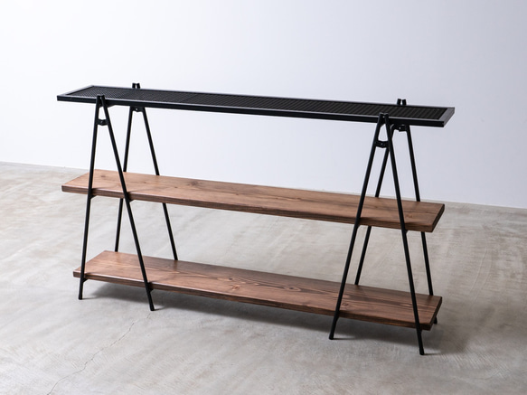 【商品内容】 シンプルなデザインのAフレームの3段アイアンシェルフ。 アイアン天板はメッシュ天板を使用。 杉板はあえて節ありを使用し、自然塗料の古色ブラウンで仕上げる事により、インダストリアルな雰囲気に仕上がっております。 アイアンと杉板の相性がとても良く男前インテリアの、仕上がりとなっております。 天板の長さを120㎝〜140㎝からお選びいただけますので、ご自身のお部屋に合わせたライフスタイルが可能。 ※杉板に関して節や抜け節があります。 【セット内容】 鉄脚×1 アイアン天板×1枚 杉板×2枚 【重量】 ・20キロ程 【材質】 ・鉄脚 アイアン ・杉板 【カラー】 ・アイアン マッドブラック ・杉板 古色ブラウン 【サイズ】 ・鉄脚D280×H800 ・天板 120㎝〜140㎝からお選びいただけます。 【納期】 場合により、3週間程掛かる場合があります。 お急ぎの方は、お問い合わせ下さい。