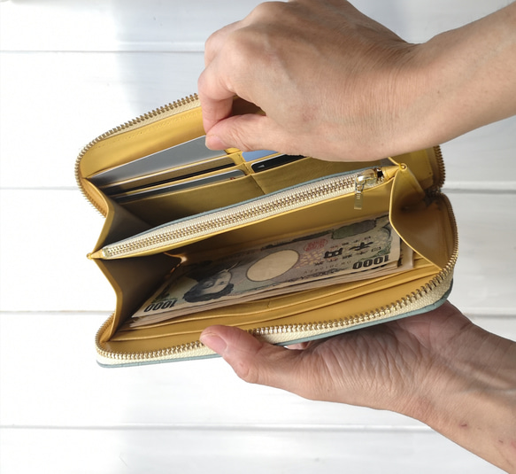☆こちらは受注生産の商品です。約30日後の発送となります。 *マチョッラ定番モデルの長財布。 パスポートもすっぽり、カードも12枚入り十分な収納力です。 キラキラと虹色に光る☆オーロラ加工をした牛革です。 しっかり厚みがあり柔らかな革です。 オーロラは加工上、模様の切り替え線がある場合がありますのでご了承くださいませ。 Instagramで動画が見れます☆ *中はピンク、コーラルレッド、イエロー、 ミントグリーン、オレンジ、カーキ、ベージュ、 ライトブルーの山羊革8色展開です。 お好きなカラーをお選び下さい。 ファスナーはそのままグレー生地で製作いたします。 ※画像のターコイズブルーご希望の方は備考欄に『ターコイズブルー希望』とご記入よろしくお願いします。 *フリンジと小さな鈴がついています。ファスナー部分のフリンジの有無はオプションで選べます。 ※天然素材の性質上、小さなキズがある場合があります。 サイズ:横約19.5センチ×縦約11センチ×マチ約2センチ 素材 : 表側 牛革ヌバック 内側 国産山羊革 ファスナーはシルバー金具になります。