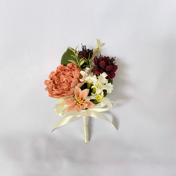 ※こちらの作品はご注文をお受けしてから一つ一つ丁寧に手作りいたします。 注文が混み合う時期はお届けに1〜2ヶ月程度かかる場合がございます。 ※お急ぎの場合やお届け希望日がある場合は、可能な限り早く制作いたしますので「質問する」のボタンから事前にご相談くださいませ。 ◉ テラコッタ&バーガンディのアンティーククラッチブーケ ◉ テラコッタ色のローズとバーガンディのオンシジュームを使った、アンティーク調のウェディングブーケです。 オレンジのランキュラスやベージュのローズを合わせて、あたたかな色味とレトロな風合いに。 ホワイトコスモスと小花を合わせて、やわらかな印象をプラスしています。 今人気のドライフラワー風アーティフィシャルフラワーを使用し、ナチュラルなアンティーク感を表現しています。 ◉全て厳選されたアーティフィシャルフラワー(高品質造花)◉ ・本物の生花やドライフラワーのようなリアルさをお楽しみ頂けます。 ・式や撮影の時に花が散ってしまう心配がない耐久性の高さも魅力です。 ・枯れる心配がないので、前撮りでも安心してご使用いただけます。 ◉壁にかけて飾れて思い出を永く残せます◉ ・ブーケの後ろに特殊な壁掛けリングがついていて、フックにかけるだけで壁に飾っていただけます。 (「アトリエレモンリーフの魔法のアシストリング」意匠登録済み @lemonleaf.jp) ・枯れることなくお手入れ不要で、思い出のブーケをそのまま永く残して楽しめます。 《掲載写真のブーケサイズ》 (約)縦42×横30cm そのうち持ち手の茎の長さが18cmです。 《掲載写真の使用花材》 ローズ バラ オンシジューム ラナンキュラス スカビオサ コスモス シャジクソウ など 《付属品》 ①ブーケとお揃いの花材でお作りしたブートニアをお付けしています。 ブートニアにはコサージュピンをお付けしていますので、お式の後はコサージュとしてもご使用頂けます♪ ②押しピン付きフックを同封しています。(ご自宅にあるフックにもかけて飾れます。) 《オプション》 ①お揃いの花材でお作りするヘッドドレスをお付けすることができます。 ※お花の種類や数のお写真をお送りして、ご要望を伺って打ち合わせをしてから制作いたします。 ②ブーケスタンドをお付けすることができます♪ ※ブーケは壁にかけて飾れますが、結婚式の最中に置いておくためなど必要な場合はご選択ください。 《注意点》 ・花材がメーカー欠品の場合、全体的な雰囲気は変わらないよう花材を変更させて頂きます。その際は事前にお写真を添えてお伝えいたします。 ・稀にご注文が重なって必要花材が欠品となる場合がございます。ご要望への対応が困難な際は、ご注文をお取り消しさせて頂く可能性があります。ご了承くださいませ。 ・アトリエモコ先頭の「ご注文の前にご一読ください」のページに、お花の説明をまとめています。ご覧下さいませ。 ウェディング ガーデンウェディング ナチュラルウェディング ブライダル 結婚式 前撮り 2次会 両親贈呈 結婚 結婚祝 春 夏 秋 冬 壁掛け 壁かけ ブーケ 花束 ウェディングブーケ クラッチブーケ ブートニア ウェディングフラワー ブライズメイドブーケ ナチュラルブーケ ウェディングギフト ウェディングアイテム アーティフィシャルフラワー 造花 花 フラワー フラワーアレンジ ナチュラル ガーデン エレガント 上品 アンティーク レトロ