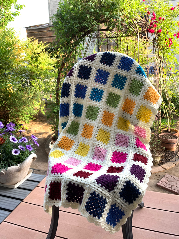 ウール100%の毛糸を多く使っています。 (サイズ) 66cmx96cm (重さ) 347g (材料) 薄いピンク(メリノウール100%) ブルー3色、ワインカラー、イエロー、オレンジ (ウール100%) 濃いピンク、パープル (スーパーウォッシュウール75%、ナイロン25%) 黄緑(アクリル100%) オフホワイト(アクリル70%,ウール30%) (お洗濯方法) 毛糸洗いの洗剤で手洗いして下さい。 |