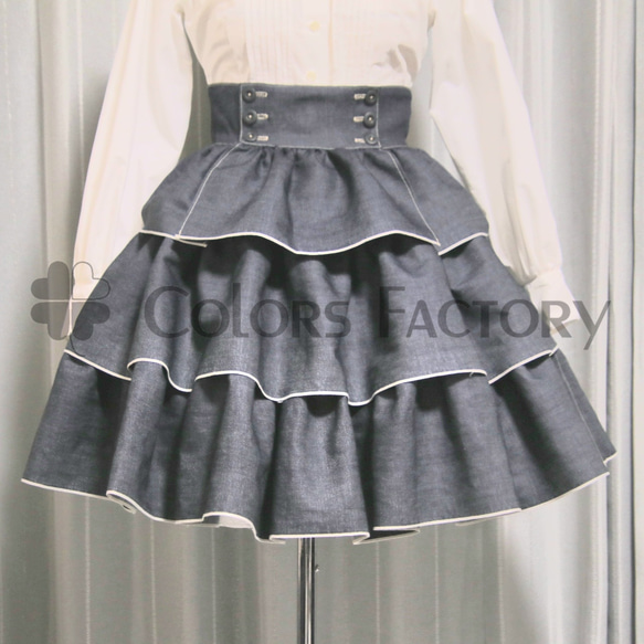 ◆制作について◆ 完全受注制作品です。発送までに3週間程お時間いただきます。 質問・オーダーからご注文いただき、ご注文内容の確認(専用ページを作成)、ご入金をこちらで確認した後、制作に入らせていただきます。 パニエや他の商品と同時にご注文いただく場合はさらにお時間いただきます。 前に何かしらの製作中の方がいる場合は、随時発送までの目安を更新いたしますが、更新が間に合わない場合もありますので、ご注文いただいた方それぞれに都度ご連絡いたします。 ◆作品について◆ 3段フリルスカートです。 蹴回し(裾の総長)は5.4m! パニエ無しでもボリュームが出るスカートです。 ステッチとリボンの色が選べます。(ステッチとリボンの色は同じです) 国産の6オンスデニムという軽いデニムを使用しました。 各段の裾は生地の耳を使用しました。 ボタンホールは全て手かがりです。見た目に多少のばらつきがあります。 ボタンはミリタリーボタンを使用しました。 メタル風錨ボタンへ変更もできます(オプションで追加料金)。 現在型紙がMサイズ(9号~11号相当、ウエスト64~68㎝くらい)のみ出来上がっております(着用画像参照)。 ウエストサイズの変更等ご要望がありましたら、ご購入前に一度メッセージにてご連絡ください。(丈の変更はこの商品はできません) ジャストウエストから50㎝で膝が出る丈です(身長160~165㎝程を想定しております)。 ◆制作風景◆ ◆ 色 ◆ ステッチの色が変更できます。 ・25 - red (レッド) ・92 - pink (ピンク) ・35 - orange (オレンジ) ・45 - yellow (イエロー) ・65 - green (グリーン) ・97 - sax blue (ブルー) ・39 - beige (ベージュ) ・99 - natural (生成) オプション欄から色番号の選択をお願い致します。また、編み上げリボンの色は選択いただいた色と同色になります。 ◆品質◆ 綿 100% (シワになりやすいです) ◆関連商品◆ この商品に合うパニエはこちら↓ #ロリータ #ロリィタ #フリル #編み上げ |