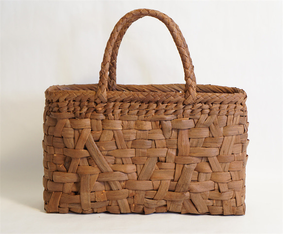 【サイズ】(約)最大幅 33 cmx高さ 21 cmx奥行 11.5 cmほど 【重さ】(約) 560 g 【編み方】本体:乱れ編み / 縁:八の字編み 【素材】やまぶどう(一番皮) 巾着素材:綿麻(中布と内ポケット付き) 一番皮とは…外側樹皮にほとんど手を加えずありのままの状態で編み込んだものです その為お色はシックな濃いめで自然の蔓の味わいを存分に感じられます。 天然山葡萄の蔓のバッグかごです。山に自生する山葡萄のつるを使用し熟練した職人さんが手作りで編み上げています。天然素材の丈夫で美しい一生ものです。 一度山葡萄のかごを使って見ませんか。使えば使うほど独特の味と素晴らしい風合いが増す逸品です。時とともに深みを増す「育てる」バッグです。 ※お客様に知っておいていただきたいこと 性質上ひごに節・ムラ・剥がれ・繊維に沿った割れなどがございます。 自然素材の特性としてご理解ください。 使い込むことにより皮の剥がれなどは色が馴染み風合いが増してゆきます。 繊維に沿った割れも強度的には問題がございませんので、ご安心ください。 手作り商品ですので、1点、1点サイズ・重量・風合いなどに違いがございます。 画像は、見本になりますがご了承の上、ご購入お願い致します。 ※出来るだけ実物のお色に近づける様に撮影しておりますが、室内照明での撮影の為、商品画像と実物のお色は多少違う場合が御座いますのでご了承下さいませ。お使いのモニター設定(明るさ・コントラスト等)によっても色の見え方が異なります。